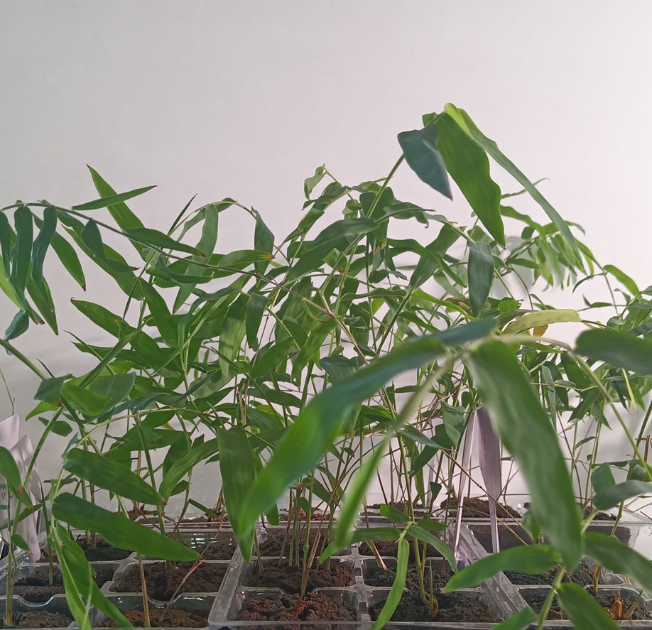 Healthy young Thai Temple Bamboo seedlings grown from our Thyrsostachys siamensis bamboo seeds in our germination nursery. Also commonly referred to as Monastery Bamboo, Thai Bamboo, and Siam Bamboo. All seedlings have well-developed roots in a nutrient rich rooting plug. (These are not “bare root” plants.)